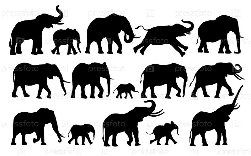 Набор силуэтов больших и маленьких слонов