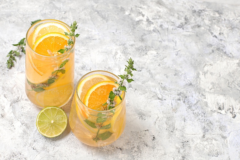 Детокс-напиток с лимоном, мятой, лаймом и зеленым яблоком на светлом столе, мохито или коктейль улучшает обмен веществ, способствует снижению веса и укрепляет иммунитет, концепция здорового образа жизни, селективный фокус