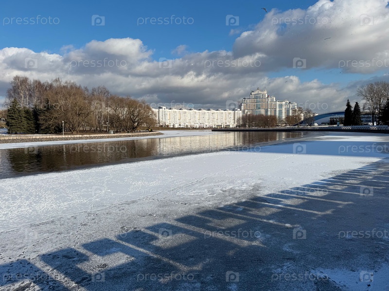 МИНСК, БЕЛАРУСЬ, 20 ФЕВРАЛЯ 2025 г. Набережная реки Свислочь в районе Немиги зимой