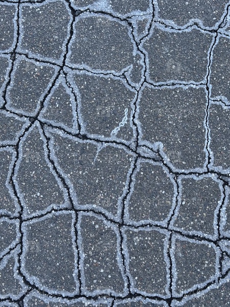 Треснутый асфальт. Кристаллы льда и соли по краям трещин