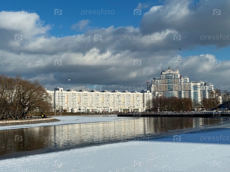 МИНСК, БЕЛАРУСЬ, 20 ФЕВРАЛЯ 2025 г. Набережная реки Свислочь в районе Немиги зимой