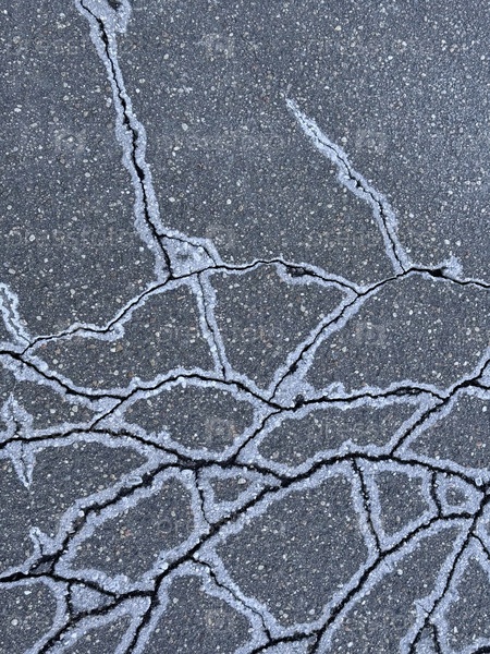 Треснутый асфальт. Кристаллы льда и соли по краям трещин