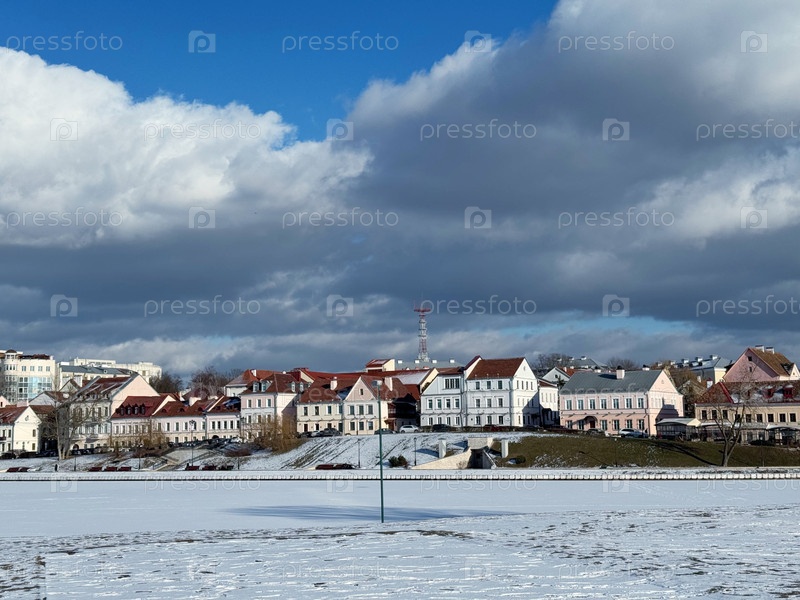 МИНСК, БЕЛАРУСЬ, 20 ФЕВРАЛЯ 2025 Вид на Троицкое предместье зимой. Набережная реки Свислочь в районе Немиги зимой
