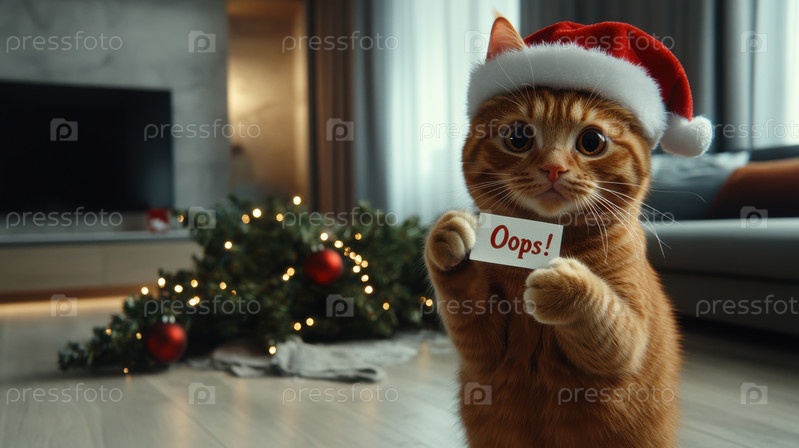 Рыжий кот в шапке Санты держит записку Упс на фоне упавшей рождественской елки