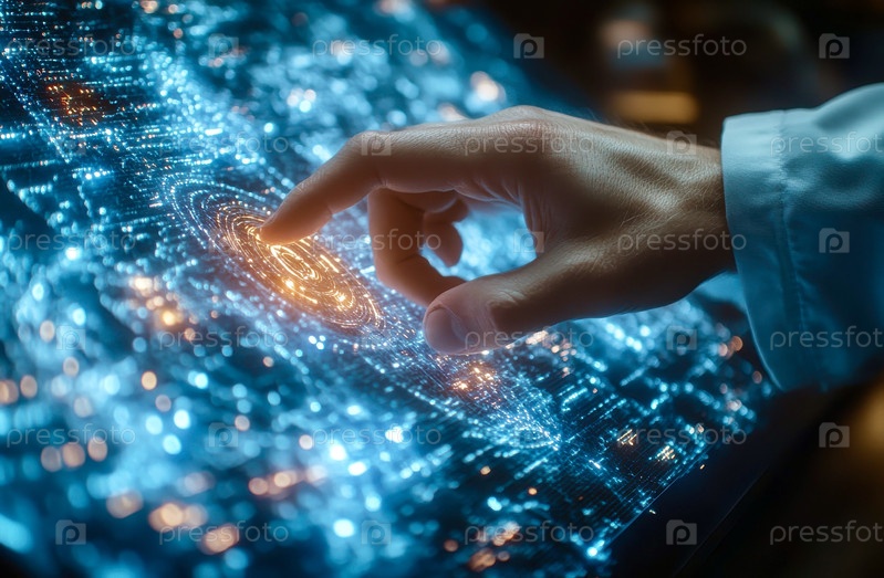 Рука взаимодействует с цифровым дисплеем, высокотехнологичный дизайн