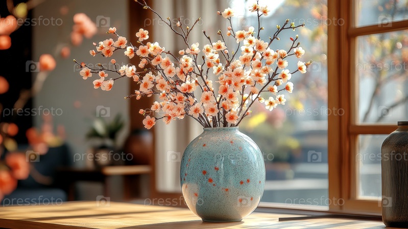 Канун Лунного Нового года, символ ветки персикового цвета в вазе на деревянном столе в солнечном свете у окна