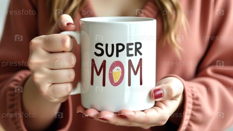 Крупный план женской руки, держащей кружку с надписью «супермама»