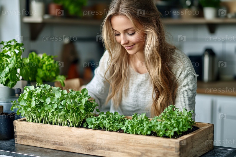 Женщина высаживает микрозелень в деревянный ящик