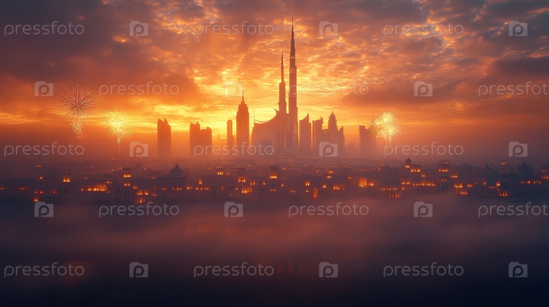 Городской пейзаж на закате с фейерверками и туманным фоном