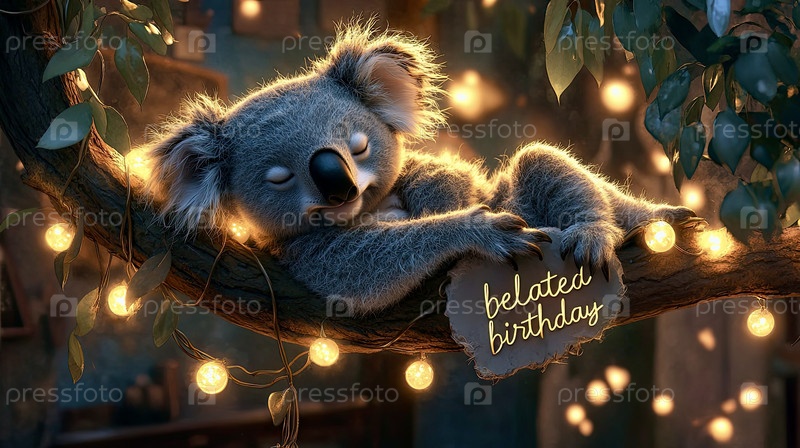 Спящая коала на ветке дерева, мягкое освещение и фраза «Просрочен день рождения»