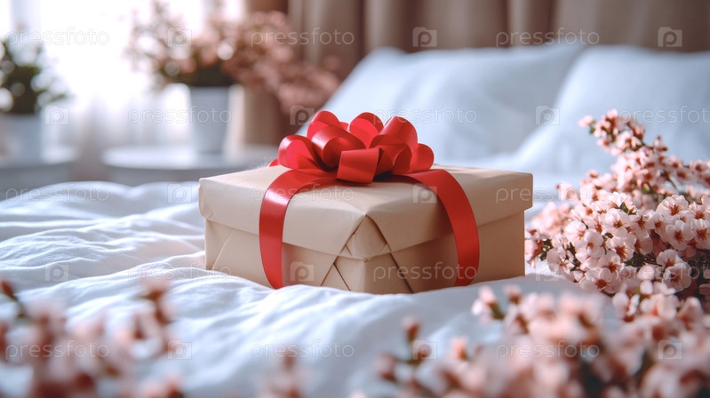 На белой кровати, застеленной белым постельным бельем, лежит подарочная коробка с красной лентой, окруженная цветами вишни