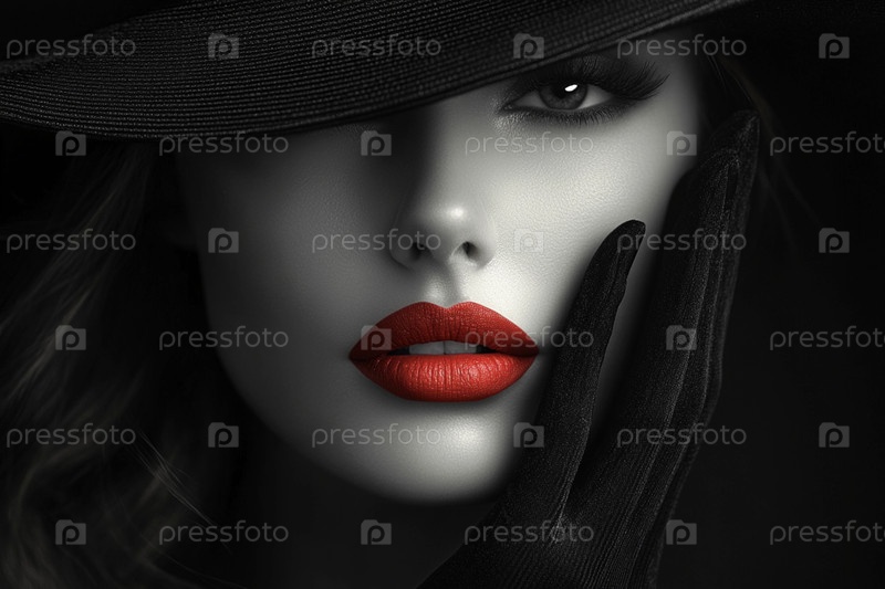 Крупный план черно-белого портрета женщины в черной шляпе и перчатках с красными губами