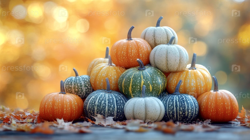 Тыквы разных сортов, сложенные на столе на фоне осенних листьев