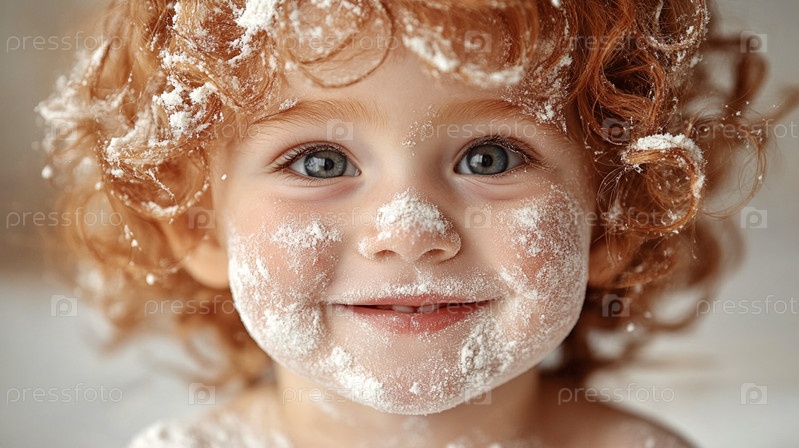Очаровательный ребенок с мукой на лице, вьющимися волосами, улыбающийся крупным планом. Всемирный день ребенка