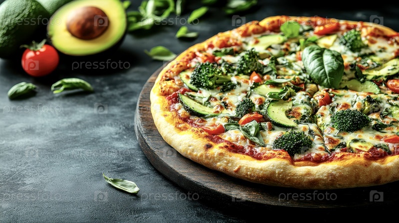 Веганская пицца с сезонными ингредиентами: помидоры, авокадо, зелень, брокколи