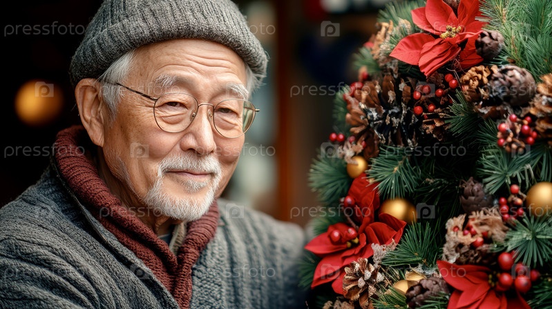 Портрет пожилого японца, украшающего свой дом рождественским венком