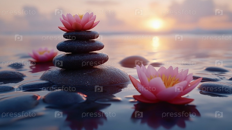 Фотография сбалансированных камней, сложенных из цветов лотоса на самой вершине пляжа на рассвете, символизирующих равновесие и спокойствие