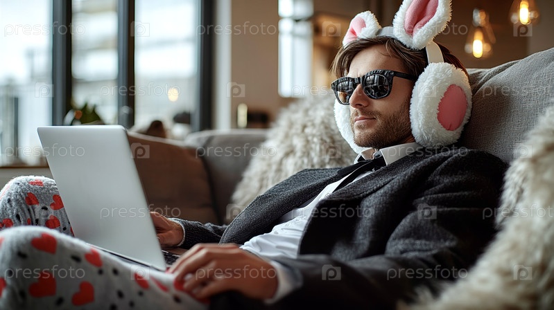 Парень в деловом костюме в нежно-розовых наушниках с кроличьими ушками с ноутбуком на коленях работает дома