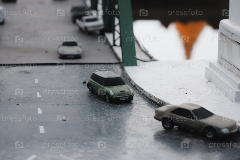 Миниатюрный городской пейзаж с игрушечными машинками на детализированной дороге, мостом и живописными элементами