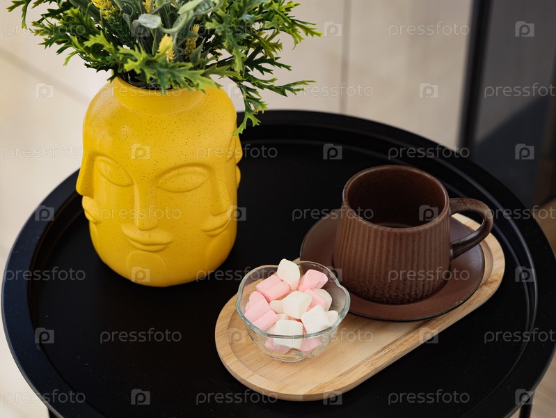 Элегантный и стильный кофейный сервиз с желтой вазой и вкусными угощениями