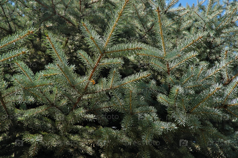 Зеленые ветви хвойного дерева на фоне голубого неба. Изолированный фон