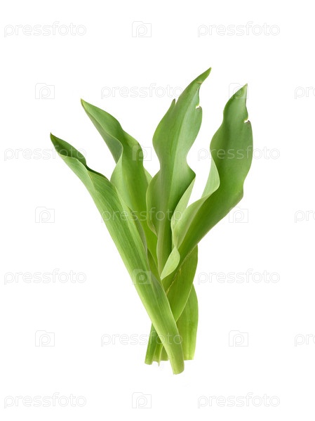 Одиночный зеленый тюльпановый лист, изолированный на простом белом фоне
