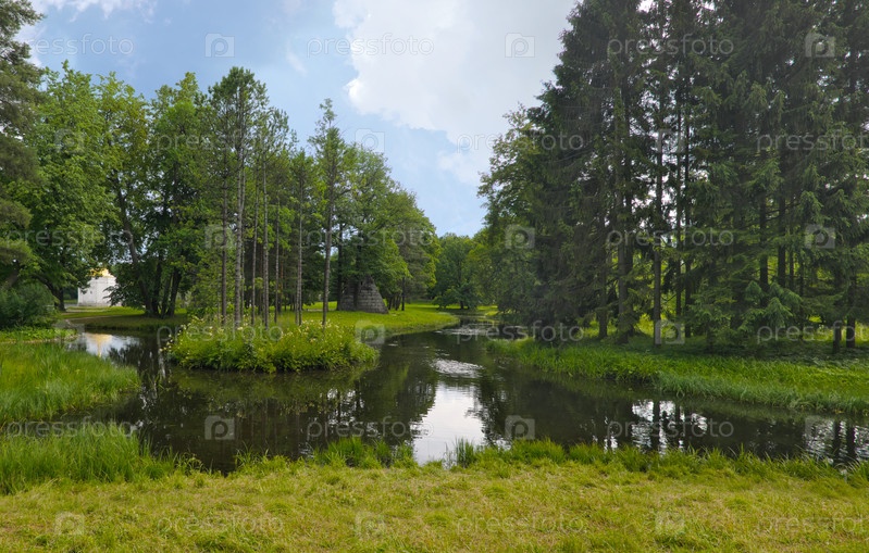 Екатерининский парк в Царском Селе (Пушкин, Санкт-Петербург), вид на Мраморный мост, Пирамидальный и Лебяжий пруды