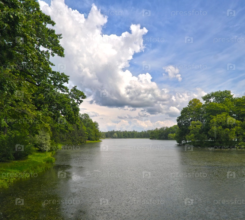 Екатерининский парк в Царском селе (Пушкин, Санкт-Петербург), вид на Большой пруд летом во время дождя