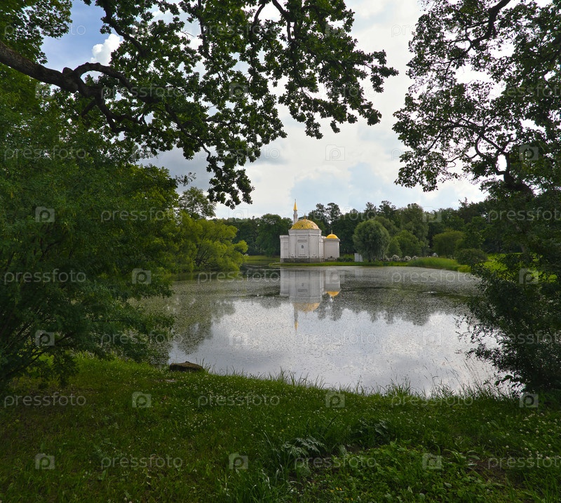Екатерининский парк в Царском селе (Пушкин, Санкт-Петербург), летний дождь с видом на так называемый павильон «Турецкая баня» на Большом пруду