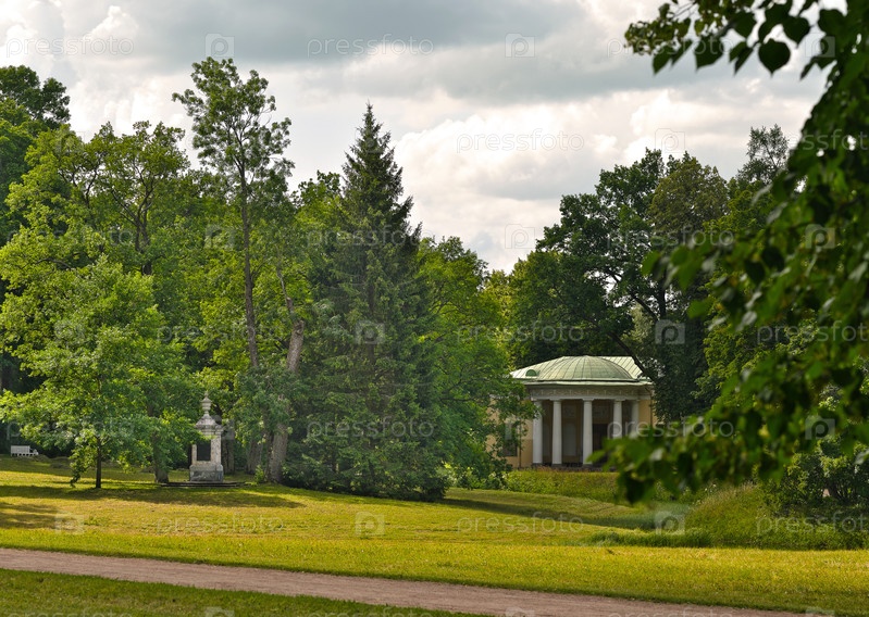 Екатерининский парк в Царском Селе (Пушкин, Санкт-Петербург), вид на Концертный зал и памятник Александру Ланскому (любимцу Екатерины Великой)
