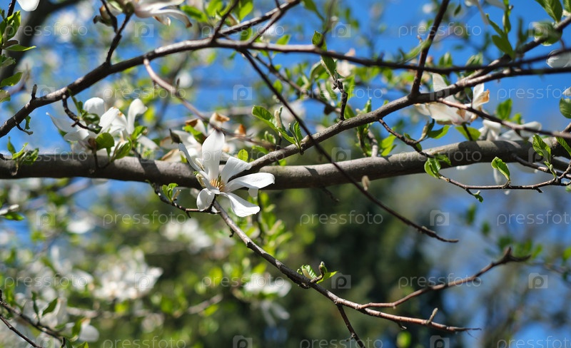 Цветущая белая магнолия на фоне голубого неба