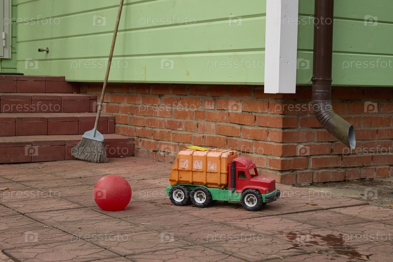 Игрушечный грузовик и мяч на кирпичном патио с метлой