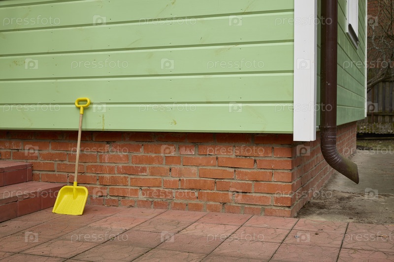 Желтая лопата, прислоненная к зеленой и красной кирпичной стене