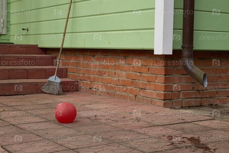 Красный мяч лежит на мощеной дорожке возле ступенек зеленого дома, рядом с наклоненной метлой. На изображении запечатлена типичная сцена на открытом воздухе с игривыми и повседневными элементами