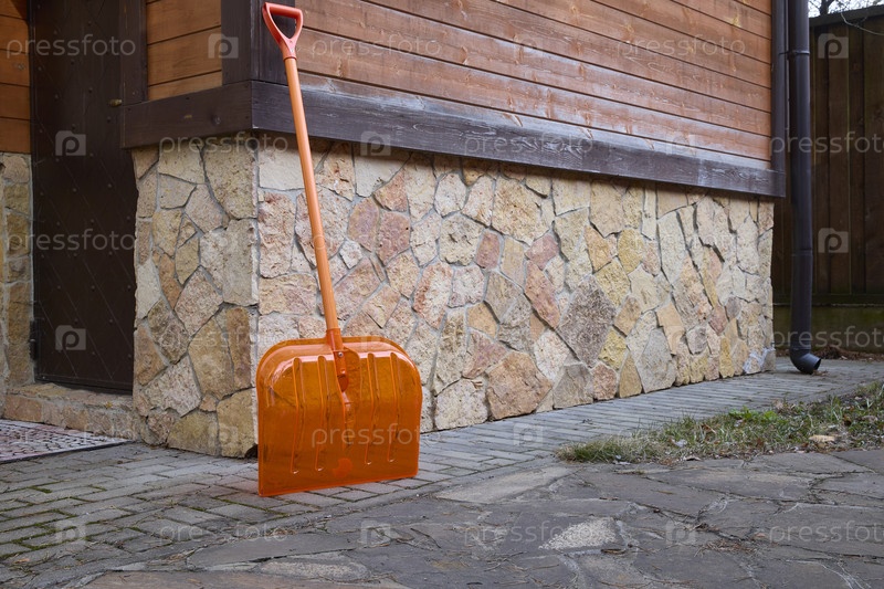 Ярко-оранжевая пластиковая лопата для снега упирается в деревенскую каменную стену деревянного дома. Сцена подчеркивает инструмент для подготовки к зиме, готовый к сезонному использованию на открытом воздухе