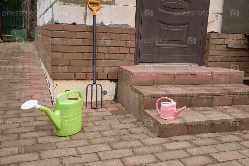 Зеленые и розовые лейки и вилы, размещенные на кирпичных ступенях снаружи дома. Садоводческая сцена подчеркивает уличные инструменты и подготовку к поливу растений