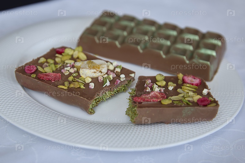 Дубайский шоколад. Изысканный шоколад ручной работы, элегантно украшенный дроблеными фисташками, яркими кусочками малины и воздушными взбитыми сливками, вызывает воспоминания о роскошных моментах и сладких наслаждениях