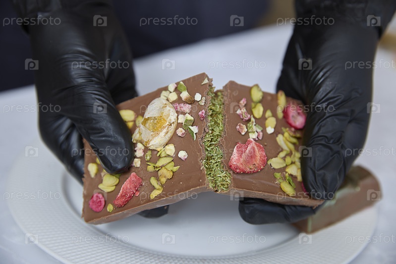 Дубайский шоколад. Кулинарное наслаждение излучает тепло, когда руки в перчатках представляют текстурированную плитку молочного шоколада, украшенную яркими фисташками, клубникой и кусочками матча