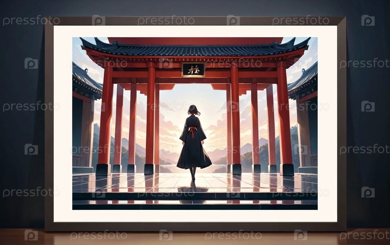 Картина стоит на столе в комнате, японская девушка в здании
