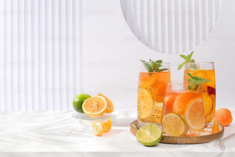 Диетический веганский коктейль с семенами чиа, лаймом, лимоном, мятой и абрикосами. Детокс-диета и концепция снижения веса, летняя вечеринка и реклама здорового образа жизни. Меню для кафе и ресторана