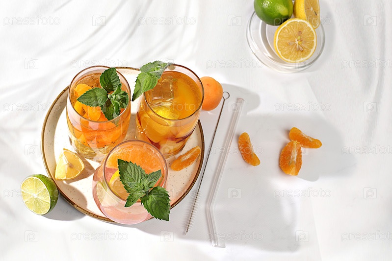 Тропический диетический веганский коктейль с семенами чиа, лаймом, лимоном, мятой и абрикосами. Концепция детокс-диеты и снижения веса, летняя вечеринка и реклама здорового образа жизни. Меню для кафе и ресторана