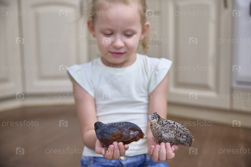 Молодая девочка нежно держит двух перепелок, внимательно наблюдая за ними в помещении. Ребенок выглядит любопытным и очарованным маленькими животными, создавая очаровательное взаимодействие