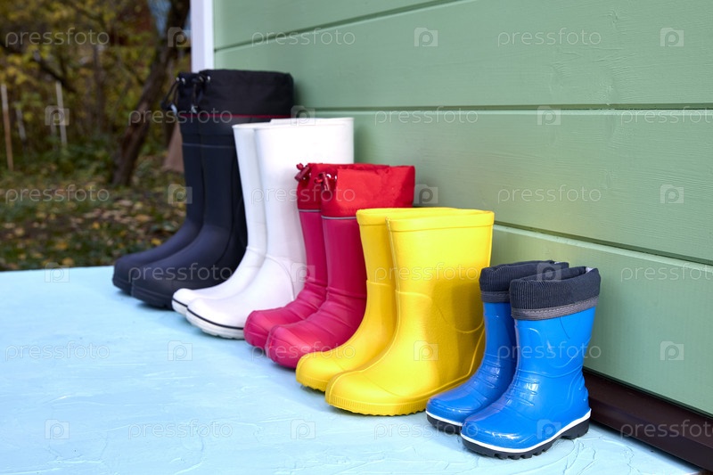 Ряд красочных резиновых сапог, аккуратно расставленных у зеленой стены. Различные размеры и яркие оттенки предполагают готовность к приключениям на свежем воздухе в любую погоду