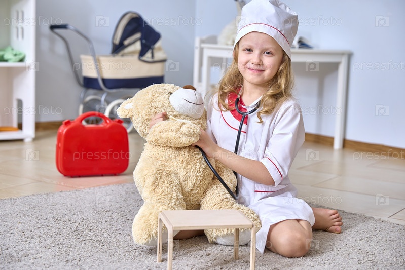 Ребенок-врач притворяется, что пациент — плюшевый мишка