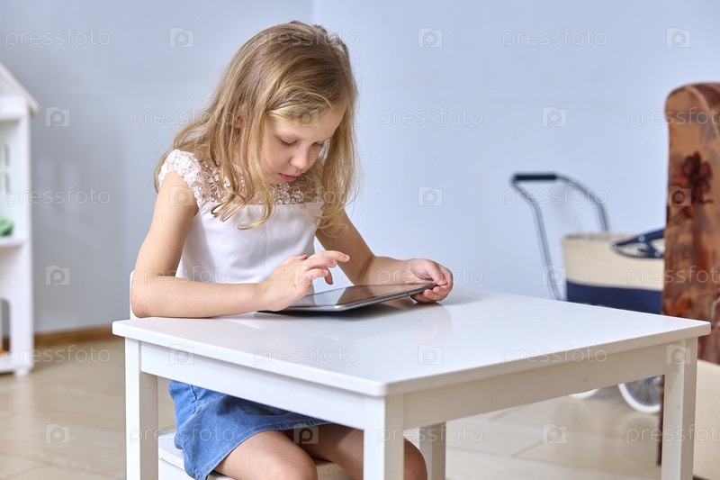 Молодая девушка с планшетом за столом с сосредоточенным выражением лица