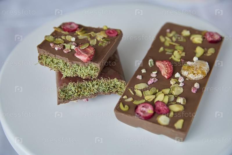 Дубайский шоколад. Богатое шоколадное искусство, многослойное наслаждение сладким баловством, украшенное яркой малиной и яркими фисташками, манящее чистым блаженством