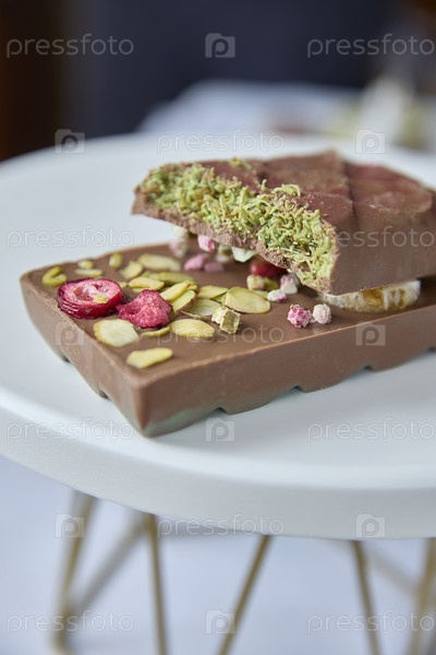 Дубайский шоколад. Вкусная плитка шоколада с трещинками, украшенная сублимированной малиной и освежающей фисташковой крошкой, вызывает наслаждение, сладость и яркий всплеск вкуса, идеально подходит для рекламы кондитерских изделий или праздничной еды