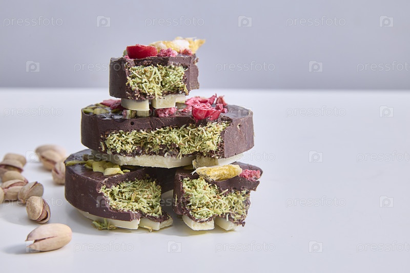 Дубайский шоколад. Нежные слои шоколада, фисташек и нежных ягод создают сладкую, удовлетворяющую сцену, идеально подходящую для кондитерских мечтаний или кулинарных блогов