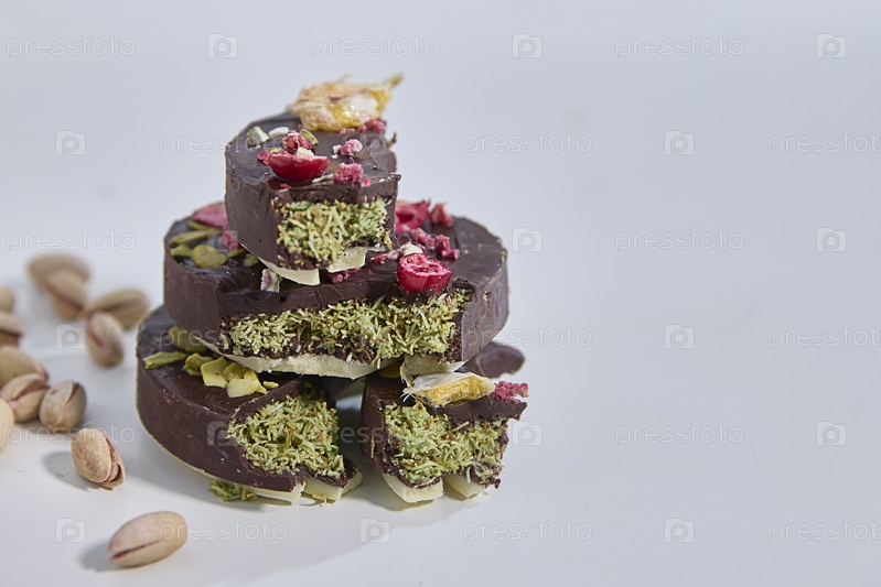 Дубайский шоколад. Изысканное лакомство из темного шоколада, украшенное яркими измельченными фисташками и сублимированной малиной, вызывает ощущение насыщенного вкуса, декаданса, подходит для брендинга продуктов питания, меню