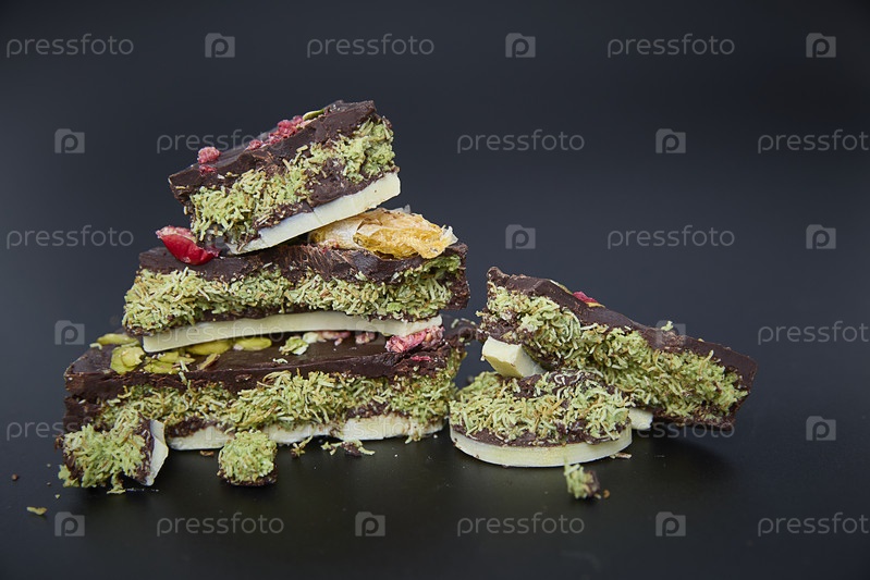 Дубайский шоколад. Роскошная темная шоколадная корочка, украшенная изумрудными фисташками и рубиново-красными фруктами, вызывает ощущение декаданса и праздника, идеально подходит для кондитерского искусства или романтического подарка